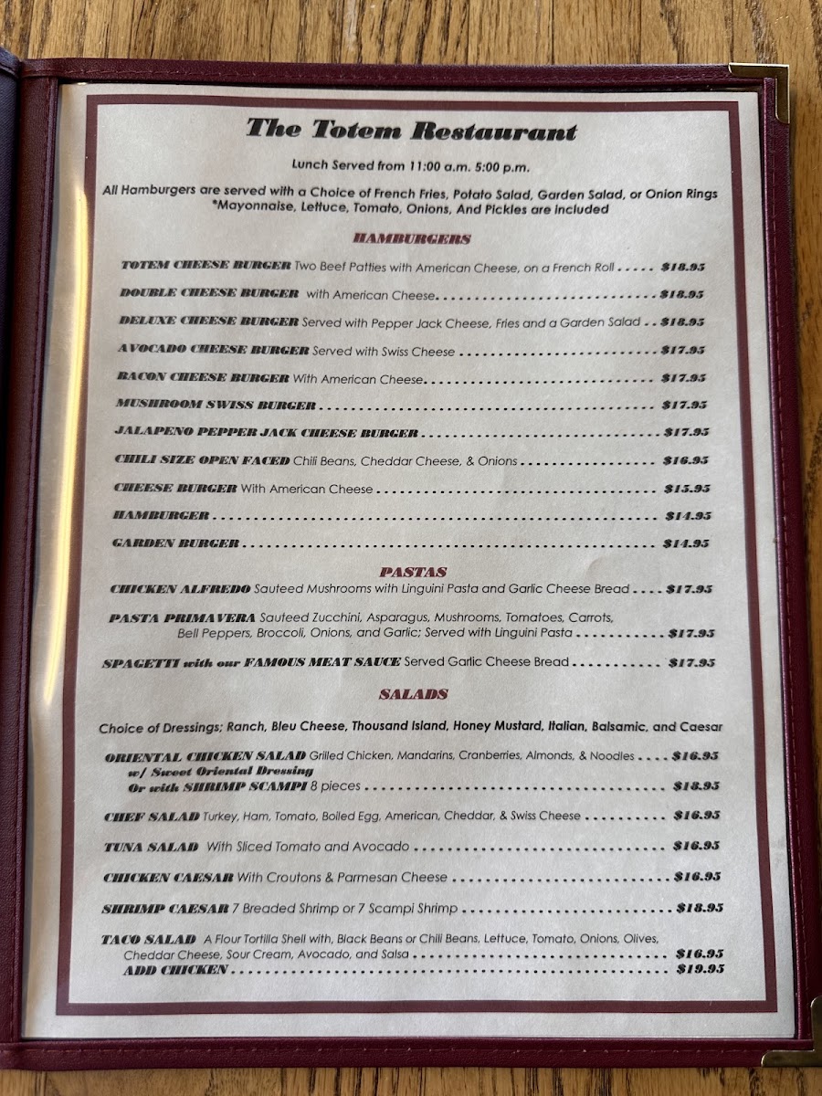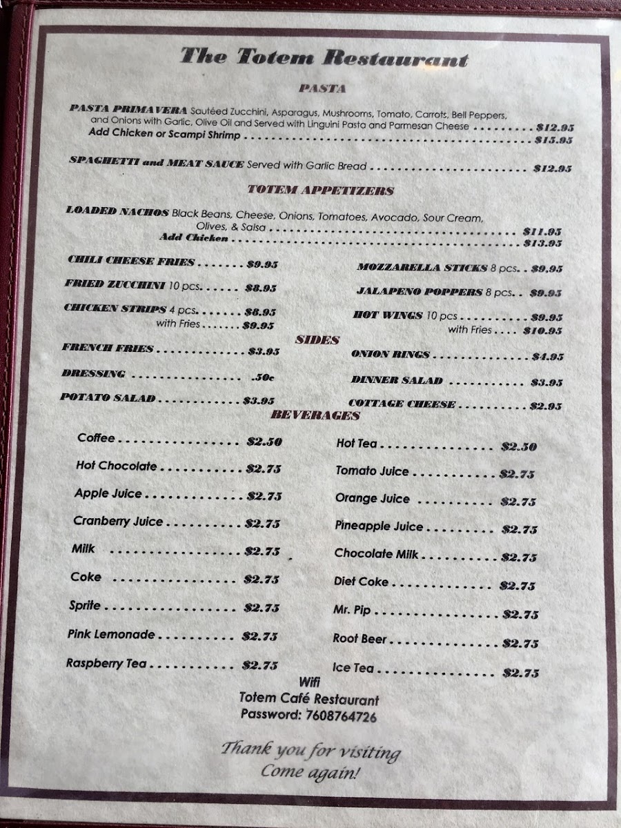 The atmosphere at Totem Cafe is warm and welcoming, featuring lodge-style decor that envelops you in a cozy embrace. The decor sets the perfect backdrop for your meal, inviting you to slowly enjoy the culinary offerings rather than rush through them. You'll feel at home, whether you're seated at a small table for two or a larger family gathering.